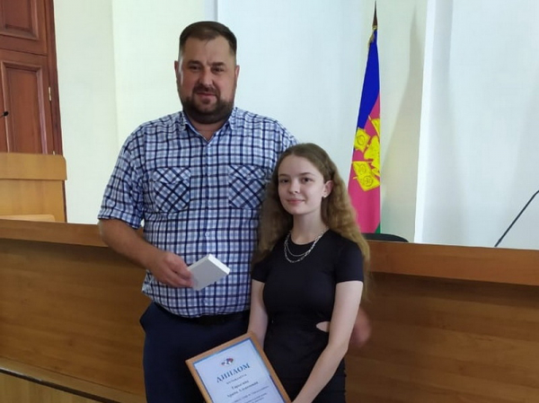 В торжественной обстановке под овации председателей, заместителей председателей и секретарей участковых комиссий, председатель ТИК Ейская городская Илья Меркаленко поздравил победительницу образовательной акции «Избирательный диктант» и пожелал удачи при поступлении в высшее учебное заведение.