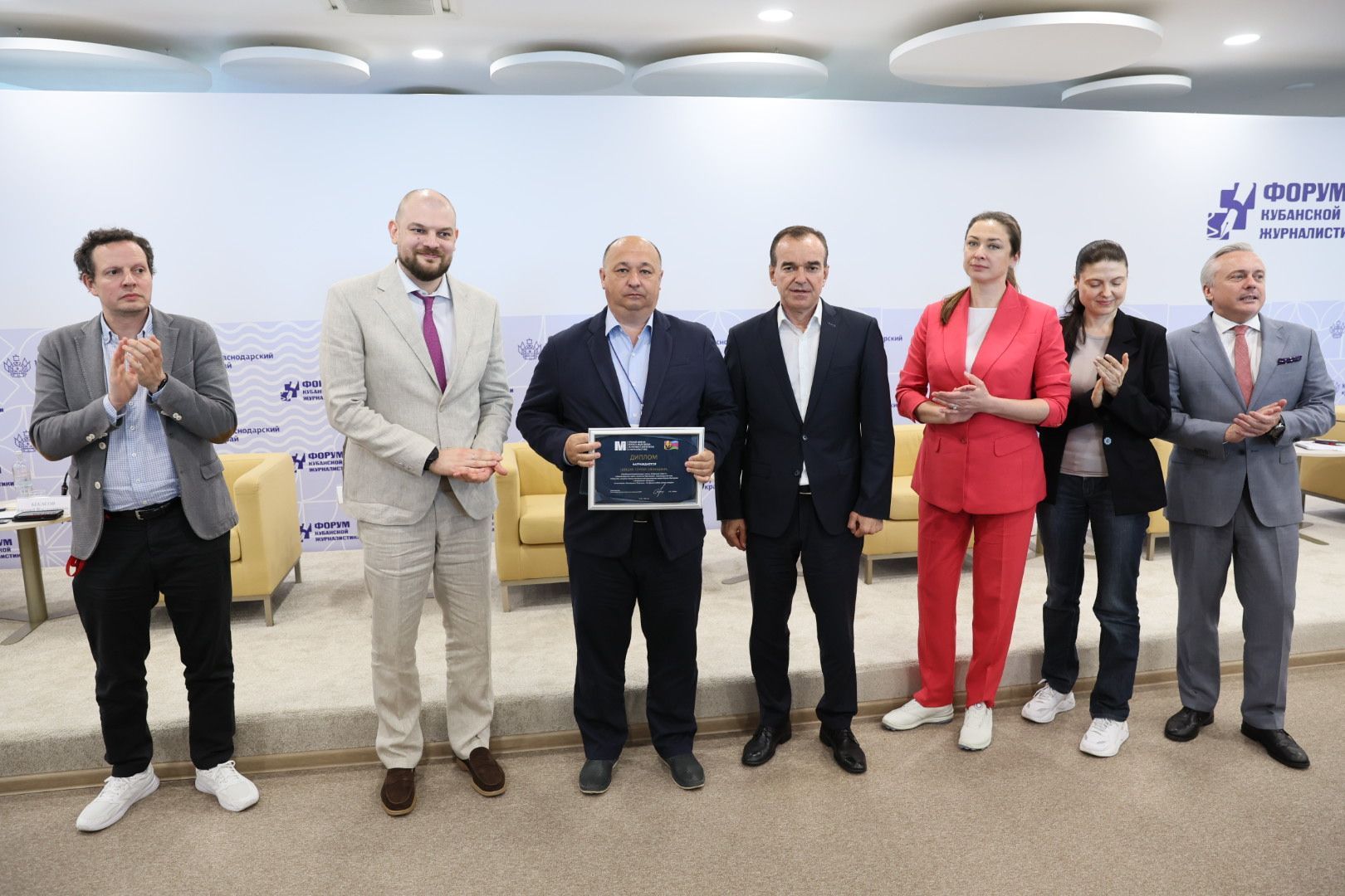 В церемонии награждения лауреатов приняли участие руководитель департамента информационной политики региона Галина Жукова , главный редактор телеканала «Россия 24» Евгений Бекасов и председатель Союза журналистов Кубани Диана Горбань . Также пригласили членов семьи погибшего при исполнении профессионального долга журналиста, в честь которого назван конкурс.