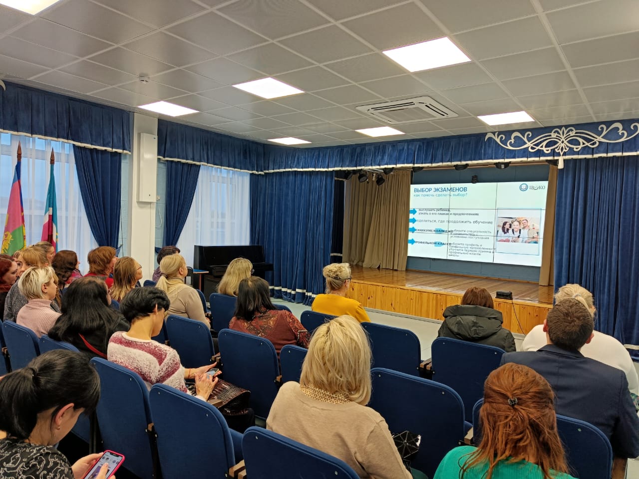 В краевом собрании приняли участие более 100 родителей девятиклассников, заместитель начальника управления образования Жижина А.В., координатор ГИА-9 в муниципалитете Белоусова Н.Г., заместители руководителей общеобразовательных организаций района.
