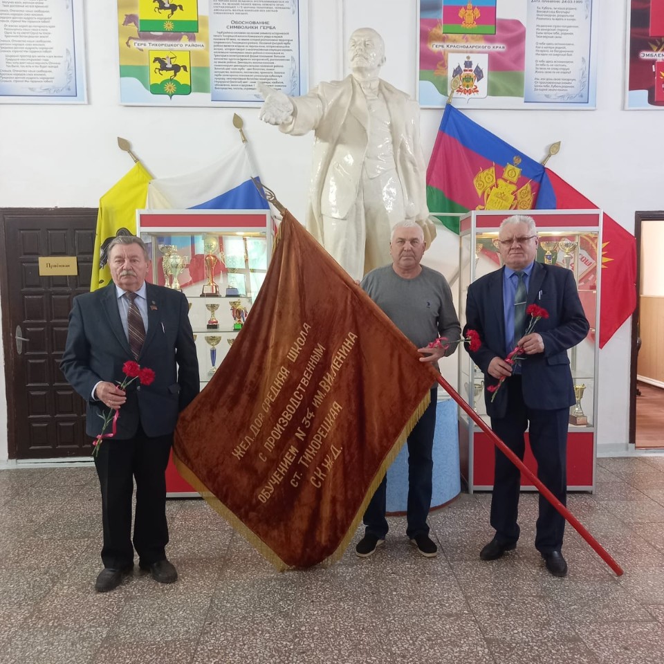 Зато в фойе школы сохранился памятник Ильичу, и на всех торжественных мероприятиях выносилось знамя, на котором написано: «Железнодорожная средняя школа с производственным обучением № 34 им. В.И. Ленина ст. Тихорецкая СКЖД».