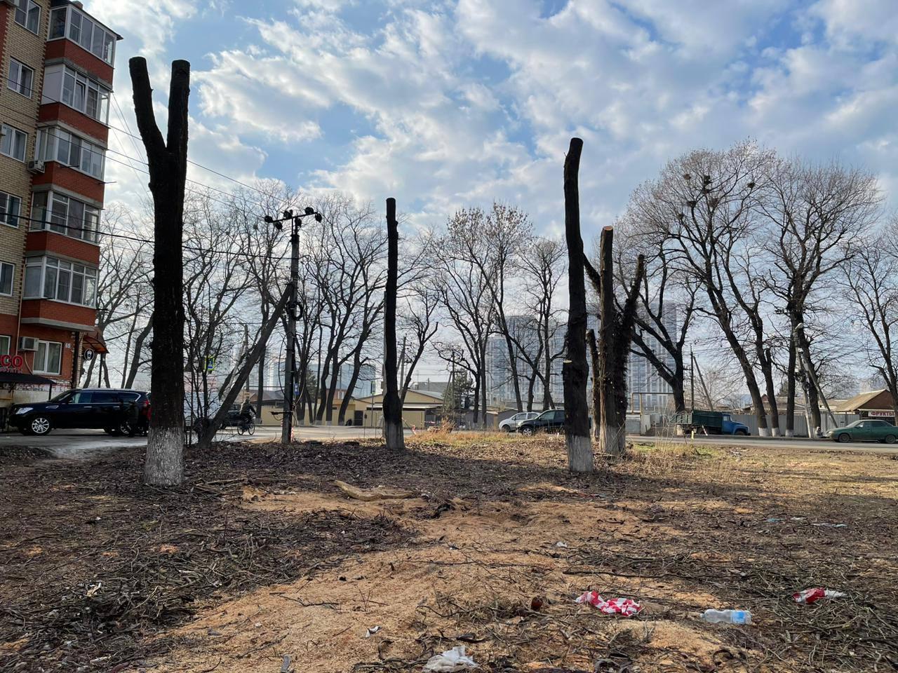 Жители п. Краснодарского пожаловались, что в районе пересечения улиц Сорока и Кирилла Россинского уничтожают зелёные насаждения.