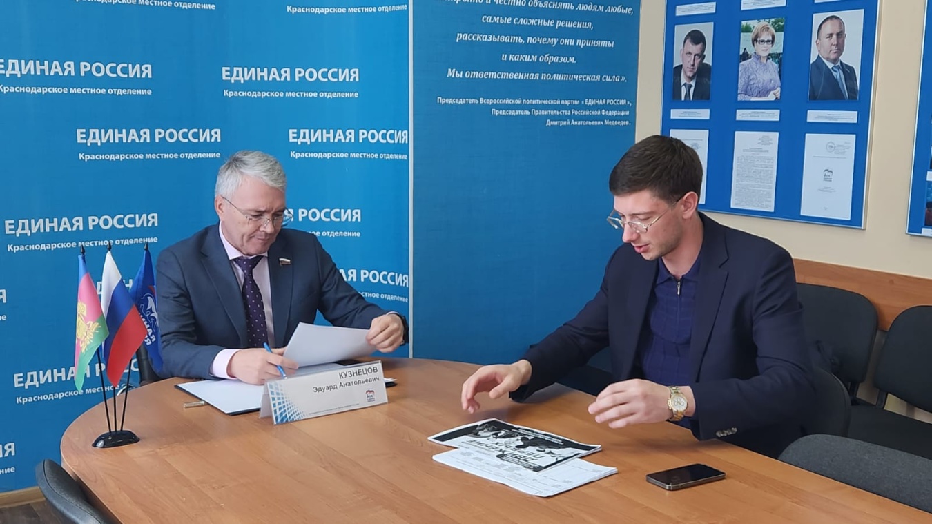 С предложением о сотрудничестве обратился к депутату Денис Евланов, председатель совета регионального общественно-государственного движения детей и молодёжи «Движение первых». Денис Евгеньевич рассказал парламентарию о создании на Кубани 1212 первичных отделений организации, а также поделился планами и задачами движения. Эдуард Кузнецов с интересом выслушал предложения о совместной работе и запланировал провести ряд встреч с кубанской молодежью в первичных организациях «Движения Первых».