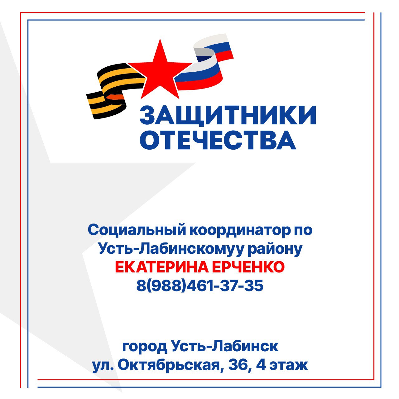 К социальному координатору фонда «Защитники Отечества» по Усть-Лабинскому району можно обратиться по адресу: г. Усть–Лабинск, ул. Октябрьская, д. 36, 4 этаж или по телефону: 8(988) 461-37-35.