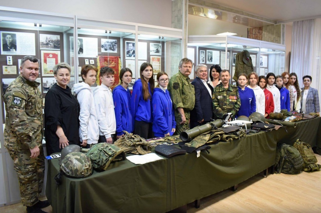 Собравшимся представили передвижную выставку «Свои на фронте и в тылу», организованную гостями мероприятия. Были продемонстрированы военная амуниция, предметы вооружения российской армии, а также трофеи, привезенные с передовой. Участник СВО Александр Рычков рассказал истории, связанные с экспонатами.