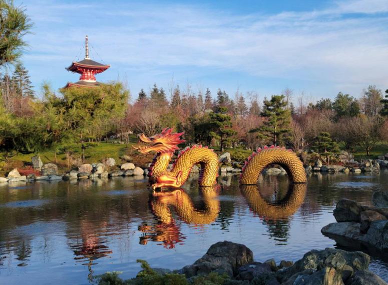 17 января завершился процесс установки в Японском саду парка «Краснодар» нового арт-объекта. Огромный золотой дракон красиво отражается в воде зеркального пруда Кагамиикэ. Особенно эффектно он выглядит в темное время суток благодаря подсветке.