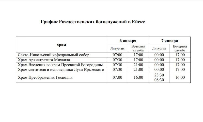 Рождественский сочельник и в саму святую ночь в ейских храмах состоятся богослужения. В ночь с 6 на 7 января Божественную литургию в Свято-Никольском кафедральном соборе Ейска возглавит Преосвященнейший Павел, епископ Ейский и Тимашевский.