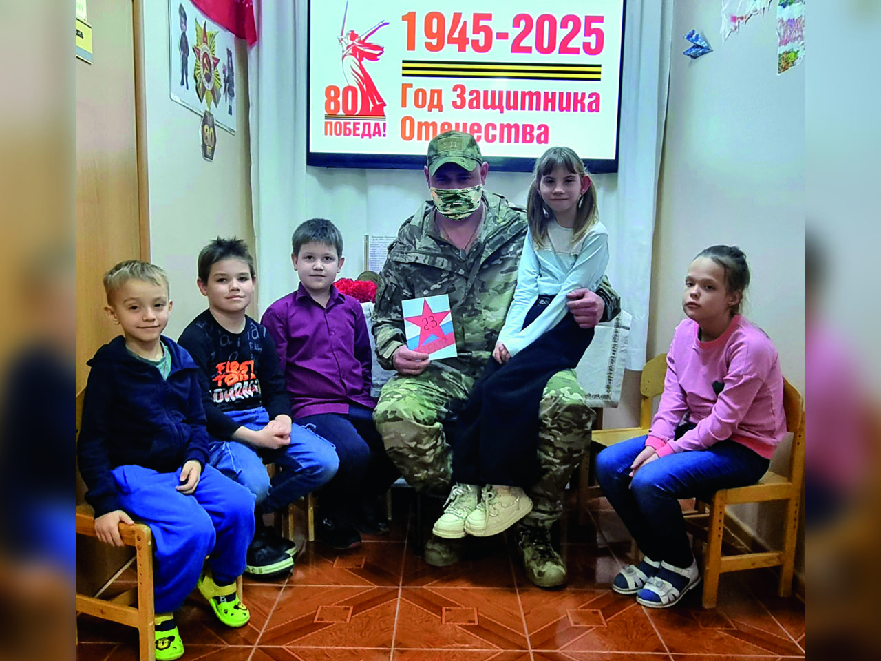 После беседы дети поспешили обнять бойца и пожать ему руку. А затем вручили на память сделанную своими руками открытку и хором сказали: «Спасибо!».