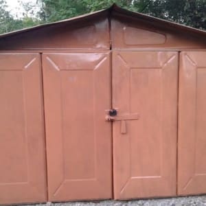 Металлический гараж с ямой в 3 метрах от дороги на охраняемой территории.